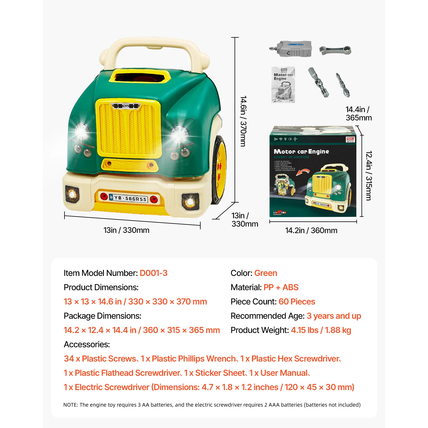 - The Gift for Little Mechanics: Made from durable ABS+PP, this engine repair toy is built to last. With smooth edges and a fun STEM design, it’s the great gift for kids 3 and up. Packed in a colorful box, it’s ideal for birthdays or holidays! (Requires 3 AA batteries, not included)