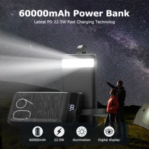 Whether for long business trips, weekend getaways, or festivals, this portable power bank with a huge 60000mAh capacity provides sustained power for your devices, eliminating battery anxiety. Features include a bright flashlight, bidirectional fast charging, and an LED digital screen that displays PD22.5W fast charging status.