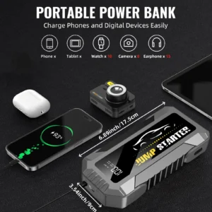 [29800mAh SUPER POWERFUL JUMPER CABLES] The car jumper starter portable is also a trip power bank with a capacity of 29800mAh, 2 USB ports can quickly charge your cell phone, tablet and other devices. And the battery jump box supports QC 18W fast charging, convenient and power saving.